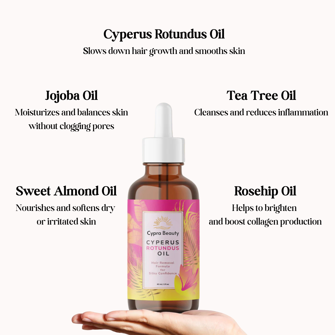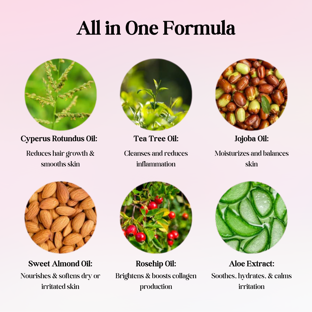 Our botanical blend harnesses the power of Cyperus Rotundus and other essential and nourishing oils to naturally minimize hair regrowth and keep your skin silky-smooth all the time.
